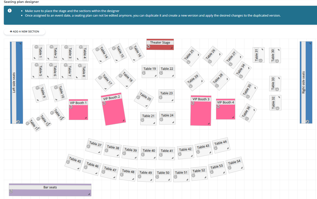 Once assigned to an event date, a seating plan layout can not be changed anymore. In which case, you can duplicate the seating plan and start making changes to the duplicated one.