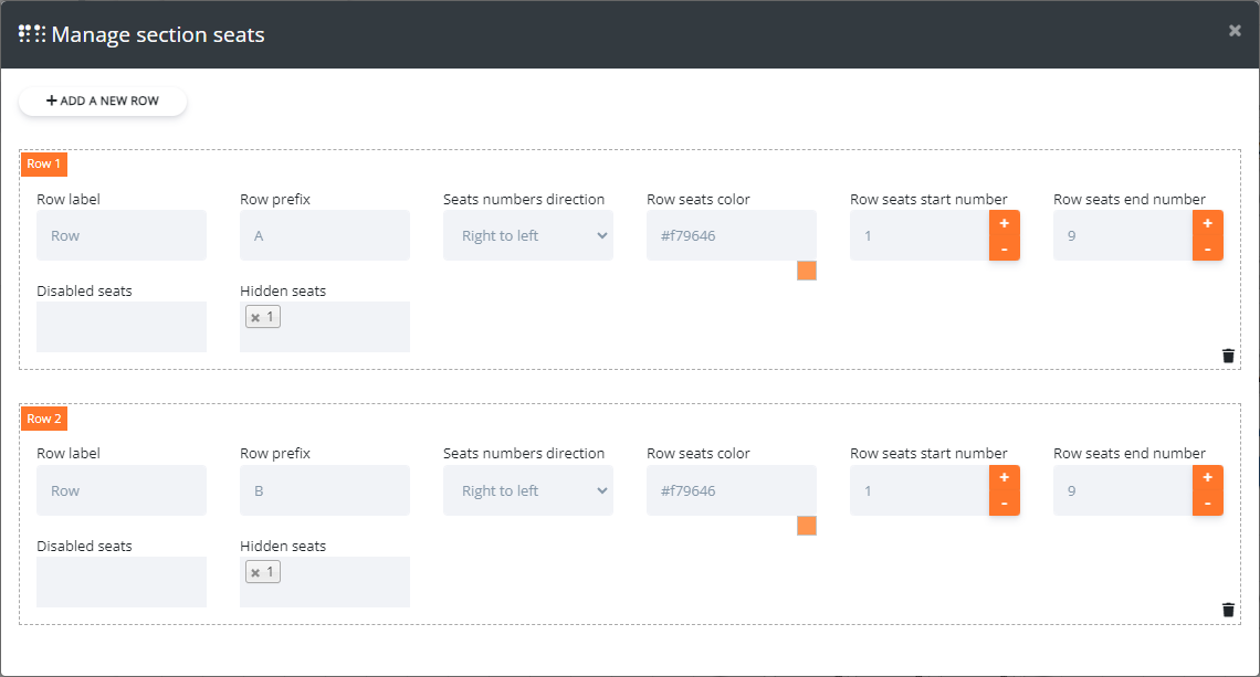 * ***Seats start and end numbers***: both fields can be configured to decide the seats numbers in the current (end number - start number - disabled seats count - hidden seats count + 1 = number of seats available for selection in the current row)